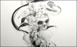 「エゴイデア!」by 八重樫洋平 <文:猿渡真彩> 「描くことは呼吸することと同じ。」 これが彼の作品と彼を象徴する言葉だと思う。 クロッキー帳を常に持ち歩き、時間が出来るとポーズや表情のスケッチを何枚も何枚も絶え間なく描き続ける。この何十枚、何百枚と描き続けたスケッチは積層していくという点で今回の卒業制作につながっている。 アニメーションを作るには何百、何千という絵が必要だ。地層のように積み重なった絵がキャラクターの豊かな表情と動きを生む。 彼のスケッチのスピードを見ていると迷いは全くないように感じるが、実際のアニメーション制作は何度も納得がいくまでしつこく描き直す。 顔のアップの場面であっても、体の動きが不自然ではないか実際にポーズをとることはもちろん、画面に入らない部分まで描いて確かめる。 飴をなめる少女の口元や髪の揺らぎに凝って何時間も費やすこともあったそうだ。一見、簡略化された絵の中にも細部までこだわりがあり、違和感や破綻のない世界を作っている。それが見る側を自然にアニメーションの世界に引き込むのであろう。 制作中、試行錯誤や悩みはするが「苦しい」と感じることはなかったという彼の作品からは、彼自身が絵を描くことを楽しんでいる姿勢が伝わってくる。 現実と妄想の世界で繰り広げられるキャラクターの生き生きとした動きや表情をたっぷり味わって欲しい。 | gloom by 猿渡真彩 <文:八重樫洋平> 精密に書き込まれた線から浮かび上がるマイナスの感情。ポジティブなイメージではなく、どこか陰のある幻想的な世界。普段からの「絵を描く」行為の延長で特別なものではない。積み重ね、染み込んだものをダイレクトにアウトプットした結果がこの作品である。 まず注目すべきはその集中力とスイッチの切り替えである。まず一度制作に入るとスイッチが入り、頭の中は常に作品のことでいっぱいになってしまう。そうすると自分の世界に閉じこもり、他のことがまったく見えなくなりひたすら没頭する。ただ、これはまだ完成ビジョンがわからない構想段階の状態で、その後、またスイッチが切り替わり、書き込み段階では計画を立てて今日はここまで、明日はここまで、と割り切って制作をするようになる。 実は、このスイッチ切り替えはデッサンの場合でも見て取れる。彼女のデッサンはまた特徴的で、まずきっちりとモチーフのアウトラインを取ることから始まる。形に狂いが無いか何度も何度も丁寧に確認して、そこから徐々に濃淡をつけていく手法だ。アウトラインが決まる、なんとなく完成ビジョンが見えるまで、が大切でそこから先は、視覚による画面へのアナログコピー作業になっているのだ。 大きな画面の中にバランスよく配置されたモチーフ、非現実的でありながら生々しいリアルさ。構想段階から下書き、本番まで、スイッチの切り替えにより作業スピードや緻密な描写密度がコントロールされており、そのうえで根源的なテーマであるロマンスとは何かを軸に展開された作品になっている。 |